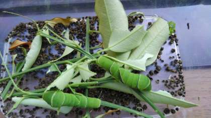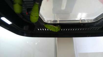 校長先生が、植木に産んだ卵を、虫かごで飼育していたら、青虫からサナギになりました。