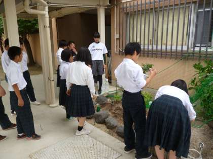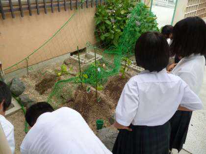 体育館横に、きゅうりやトマト、大葉などの苗を植えました。