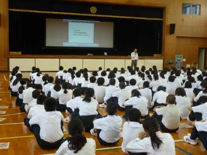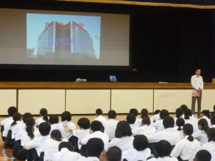 6時間目に旭警察署の少年係の方にお越しいただき、体育館でお話を聞きました。