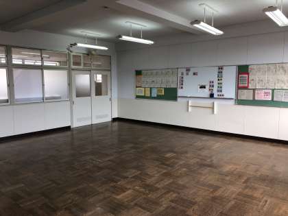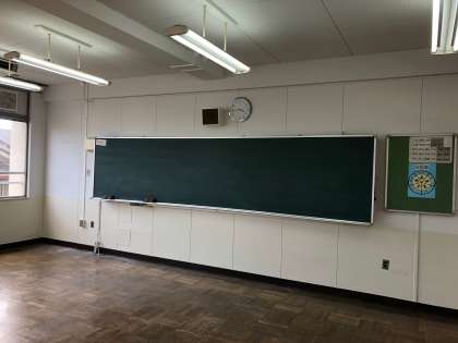 写真は1組の教室です。1組は照明器具が低い位置にあり、薄暗かったので、天井も塗ってもらいました。