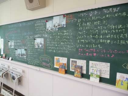 先日8月30日に、2ブロック研究発表会が開催されました。旭図書館では「ビブリオバトル」が開催されました。「ビブリオバトル」とは、自分の選んだ本についての講評を短い時間で行い、どれだけ聴いている人たちに本の面白さを伝えることができるかを競うものです。本校からは校長先生をはじめ3人の先生方がバトルに参加。その模様が黒板に紹介されています。