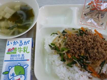 ビビンバは、韓国・朝鮮料理のひとつです。ビビンバの語源は「ピビムパプ」で「ピビム」が「混ぜる」、「パプ」が「ご飯」という意味です。給食では、肉と野菜が別々の配缶になっており、盛りつけたご飯に、肉の具、野菜の具をのせて各自で混ぜて食べます。旬の野菜であるほうれん草や大根を使用し、彩りもきれいにしています。