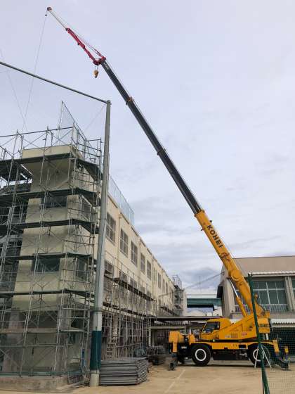 日曜日には、きれいに塗装された外壁が姿をあらわし、今日は大きな重機が入り、足場の撤去作業が行われています。