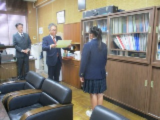 放課後、旭税務署から署長様をはじめ、旭納税協会の皆様にお越しいただき、税についての作文で入賞した生徒の表彰式を、校長室で行いました。