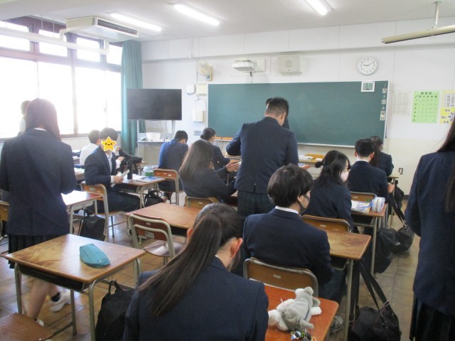 写真は3年生が体育館で始業式を済ませ、教室で学級活動を行っている様子です。