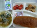 さけのマリネ 肉だんごと麦のスープ プチトマト ライ麦パン 牛乳 いちごジャム ...