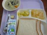 ほうれん草のクリームシチュー キャベツのサラダ 洋なし(カット缶づめ) 食パン ...