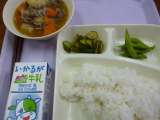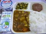 牛肉と大豆のカレーライス 焼きハンバーグ 三度豆とコーンのサラダ ヨーグルト 米...