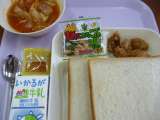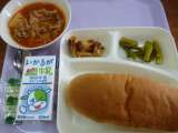 ケチャップ煮 グリーンアスパラガスのサラダ りんごのクラフティ コッペパン 牛乳...