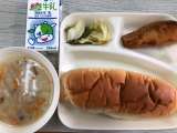 サーモンフライ 豆乳スープ キャベツとさんどまめのサラダ おさつパン 牛乳 豆...