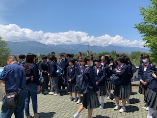 梓川サービスエリアで 昼食と集合写真を撮りました。天候は、晴れ、気温も適温で快適です。北アルプスもよく見えています。