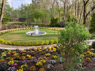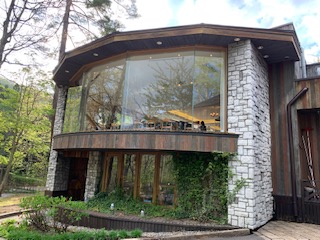 ホテル前の噴水、食事をとるレストランを外から見た写真です。