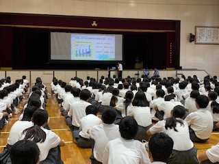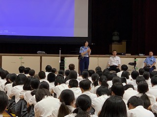 7月17日(水)旭警察署から非行防止の講話をしていただきました。最初は、少年課からは、薬物についての話がありました。言葉巧みに誘い込み、薬の依存や耐性により、薬から逃げることができなくなる危険があるというお話を聞かせていただきました。また、交通課からは、夏休みに向けて自転車の安全な乗り方について話がありました。