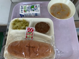 「ライ麦パン」「焼きハンバーグ」「豆乳スープ」「キャベツのカレーソテー」「牛乳」