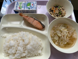 ごはん・さけのしょうゆ風味焼き・五(ご)目(もく)汁(じる)・高野どうふのいり煮(に)・牛乳