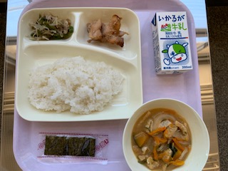 ごはん・鶏(けい)肉(にく)のてり焼き・みそ汁(しる)・野菜いため・焼きのり・牛乳