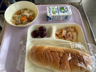 おさつパン・鶏(けい)肉(にく)とてぼ豆のスープ煮(に)・じゃがいもとトマトのチーズ焼き・ぶどう(巨(きょ)峰(ほう))・牛乳