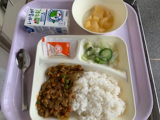大豆入り・キーマカレーライス[米粉]・グリーンサラダ・[ノンエッグドレッシング]・白(はく)桃(とう)(カット缶(かん))・牛乳