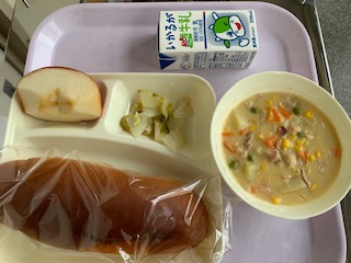 10月3日給食「コーンクリームシチュー[米粉]」