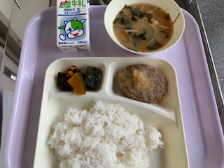 ごはん・和風おろしハンバーグ・みそ汁(しる)・かぼちゃのいとこ煮(に)・牛乳