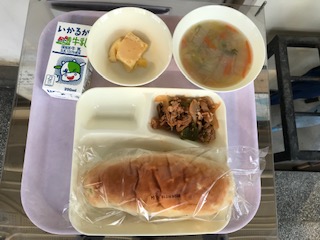 おさつパン・豚(ぶた)肉(にく)のケチャップソテー・コーンスープ