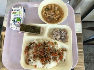 鶏(とり)ごぼうご飯・みそ汁(しる)・焼きれんこん・焼きのり・牛乳