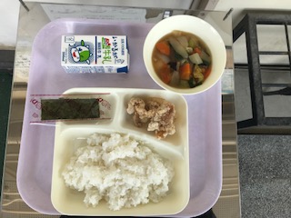 ごはん・鶏(けい)肉(にく)のからあげ・まる天と野菜のうま煮(に)