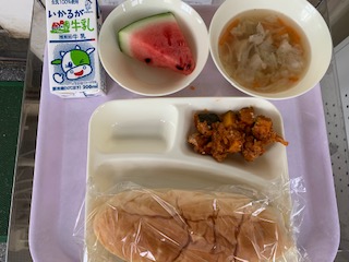 おさつパン・かぼちゃのミートグラタン・スープ・すいか・牛乳