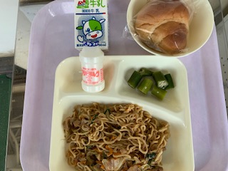 黒糖パン(小)・オイスターソース・焼きそば・オクラの甘(あま)酢(ず)あえ・発(はっ)酵(こう)乳(にゅう)・牛乳