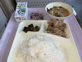 ごはん・豚(ぶた)肉(にく)の甘(あま)辛(から)焼き・みそ汁(しる)・オクラのおかかいため・アーモンドフィッシュ・牛乳