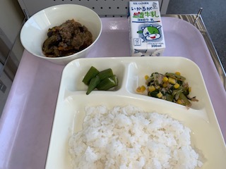 ごはん・マーボーなす・オクラの甘(あま)酢(ず)あえ・ツナとチンゲンサイのいためもの・牛乳