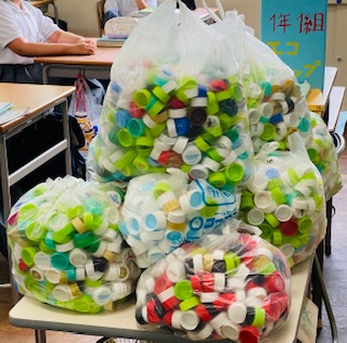 月曜日の全校集会で、生徒会執行部からエコキャップ運動の取組について、全校生徒に協力をお願いしました。毎週金曜日が回収日になります。家庭によっては、これまでにたくさんのキャップを集めているようでした。袋いっぱいのキャップを持参した生徒もいました。