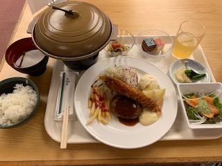 夕食 本来のメニューは、バイキングでしたが、感染防止のために個別の料理に変更しています。