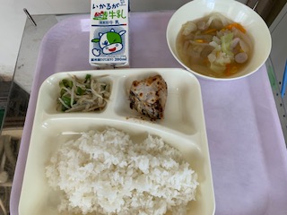 ごはん・かつおのマリネ焼き[ノンエッグドレッシング]・ウインナーと野菜のスープ・もやしとピーマンのソテー・牛乳