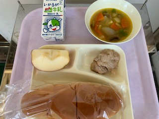 黒糖パン・鶏(けい)肉(にく)のガーリック焼き・豚(ぶた)肉(にく)と野菜のスープ煮(に)・りんご・牛乳