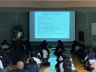 講師の井上先生からLGBTについて、貴重なお話を聞くことができました。「LGBTってどんな人?」というお話から、ご自身の体験談や友だちの話など、特別な存在ではないことを知るきっかけになりました。生徒から様々な質問があり、有意義な講演になりました。