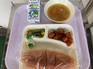 コッペパン・ソフトマーガリン・まぐろのオーロラ煮(に)・ベーコンとじゃがいものスープ・きゅうりとコーンのゆずドレッシング・牛乳