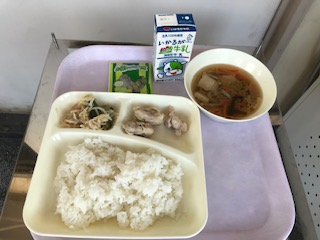 ごはん・鶏(けい)肉(にく)のゆず塩焼き・ソーキ汁(じる)