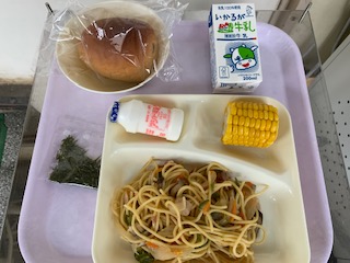 黒糖パン(小)・ウインナーときのこのしょうゆ風味スパゲッティ・焼きとうもろこし・発(はっ)酵(こう)乳(にゅう)・牛乳