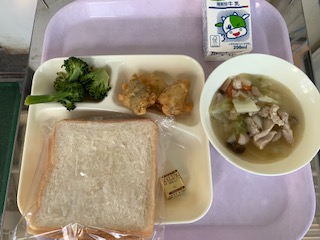 食パン・バター・白身魚のフリッター・洋(よう)風(ふう)煮(に)・ブロッコリーのサラダ・牛乳