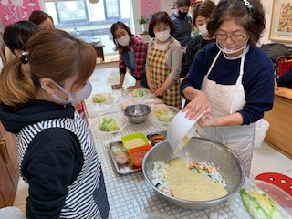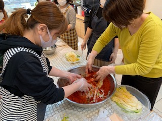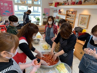 コリアタウンにある、べっぴん研究家・洪貞淑先生のキレイになるキムチ教室では、キムチづくりとキムパづくりに挑戦しました。発酵食品や美容と健康についてのお話もいただきました。