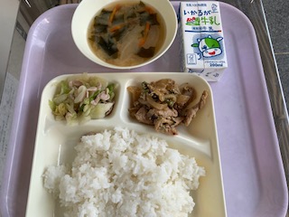 ごはん・鶏(けい)肉(にく)のごまだれ焼き・なめこのみそ汁(しる)・キャベツのいためもの・牛乳