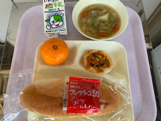 コッペパン・いちごジャム・豚(ぶた)肉(にく)と野菜のスープ煮(に)・変わりピザ・みかん・牛乳