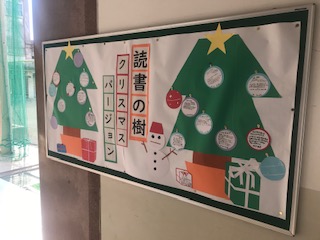 旭東中図書部は、書物を通じて様々な活動を日々おこなっています。今回はクリスマスに向けて、全部員でメッセージを飾りつけたクリスマスツリーを製作中です。クリスマス当日には、もっとたくさんのメッセージで彩られたツリーができるそうです。