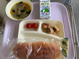 コッペパン・マーガリン・さけのマリネ・肉だんごと麦のスープ・プチトマト・牛乳