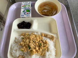 親(おや)子(こ)丼(どんぶり)★・すまし汁(じる)・黒豆の煮(に)もの・牛乳
