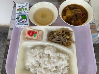 牛肉と金時豆のカレーライス(近江(おうみ)牛(うし))・ごぼうサラダ・パインアップル(缶(かん))・牛乳