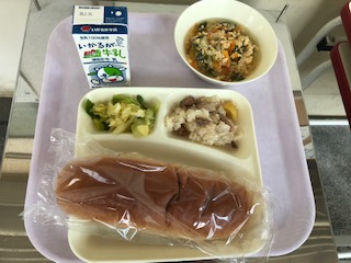 今日は、焼き豚(ぶた)、くり、しいたけの入った『中(ちゅう)華(か)おこわ』です。