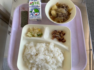 ごはん・肉じゃが・白菜のゆず風味・とら豆の煮(に)もの・焼きのり・牛乳