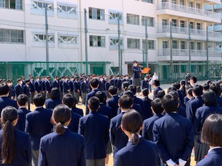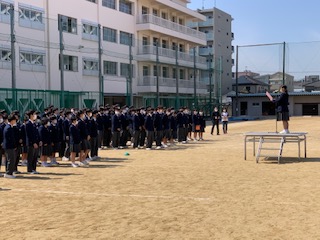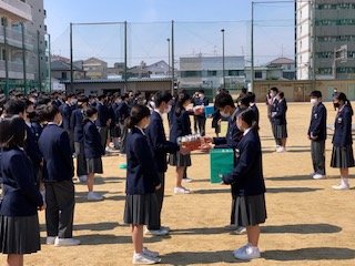 卒業式には、在校生全員が参列できませんので、毎年卒業式前に「別れの会」を開催します。去年は、臨時休校のため実現しませんでしたが、今年は開催できました。在校生と卒業生の代表からのメッセージのあと、1年生からは「メッセージカード」、2年生からは「手作りのコサージュ」が卒業生に送られました。